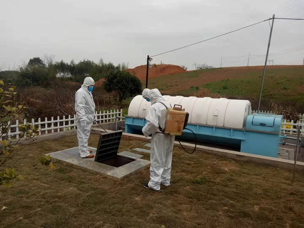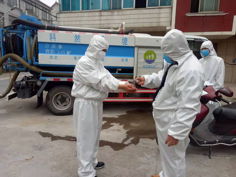 科然環(huán)境運維組員工為號召國家防控疫情政策,對各個終端和管網(wǎng)的污水池進行全面的清掏、消殺工作。